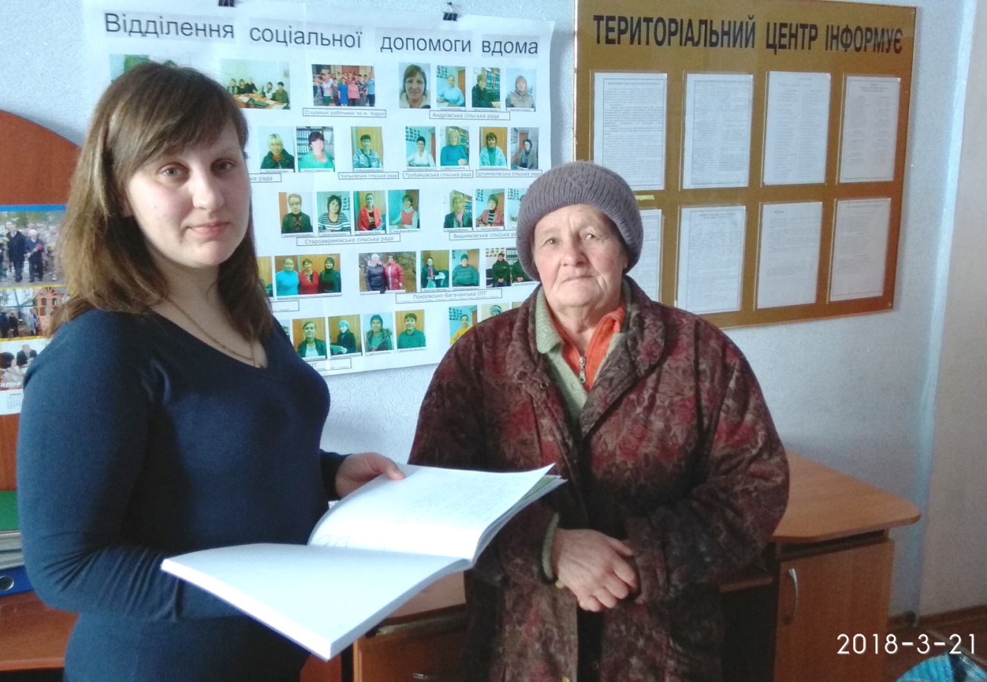 21 березня 2018 року до відділення соціальної допомоги вдома територіального центру завітала підопічна відділення - Заїка Ганна Василівна, 1937 р.н. щоб висловити слова вдячності соціальному робітнику Недосвітій Тамарі Іванівні, яка надає їй соціально-побутові послуги за місцем проживання.